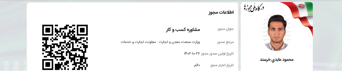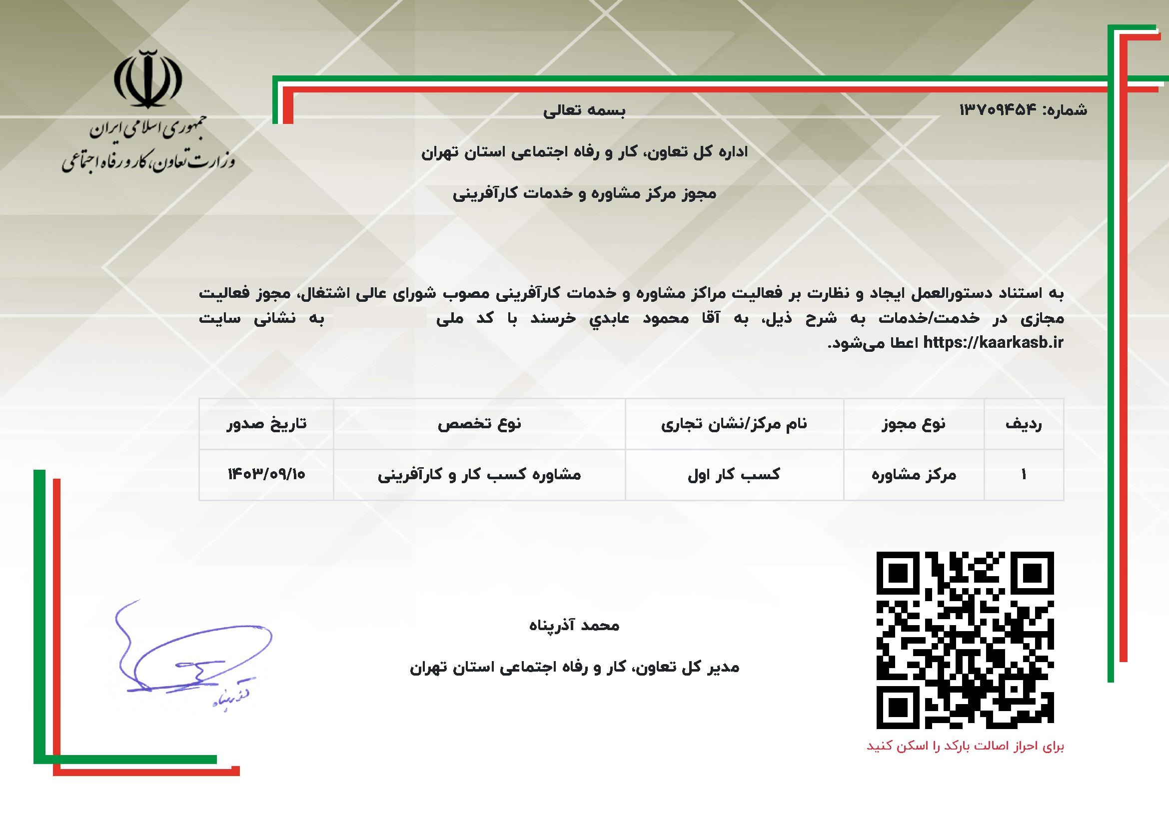 مجوز مشاوره کسب و کار رسمی و دائمی از وزارت صمت و مجوز مرکز مشاوره کارآفرینی از وزارت کار